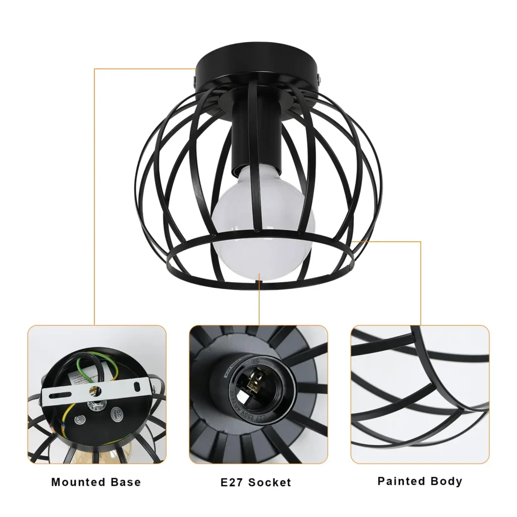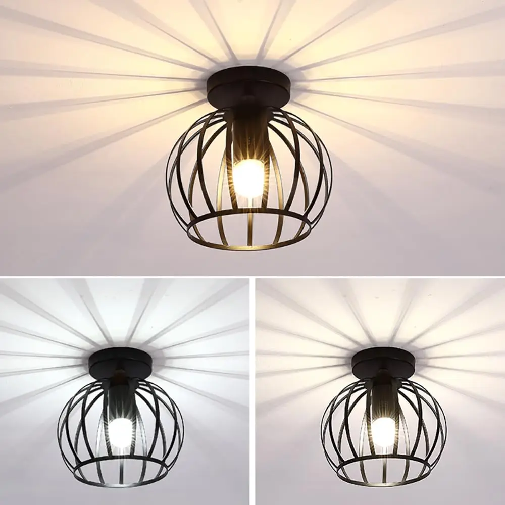 Ce plafonnier adopte un style vintage en métal façon cage, projetant un faisceau graphique au plafond. Placé dans un couloir, une entrée ou une chambre, il crée immédiatement une atmosphère chaleureuse. Grâce à son design ajouré, la lumière circule librement et donne du relief à la pièce tout en restant élégante et discrète.